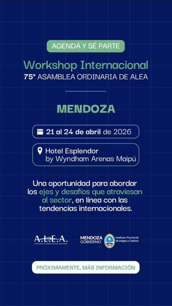 Del 21 al 24 de abril de 2026, la provincia de Mendoza será sede del Workshop Internacional y la 75° Asamblea Ordinaria de la Asociación de Loterías Estatales Argentinas (ALEA), un encuentro clave para el sector relacionado con los juegos de azar.